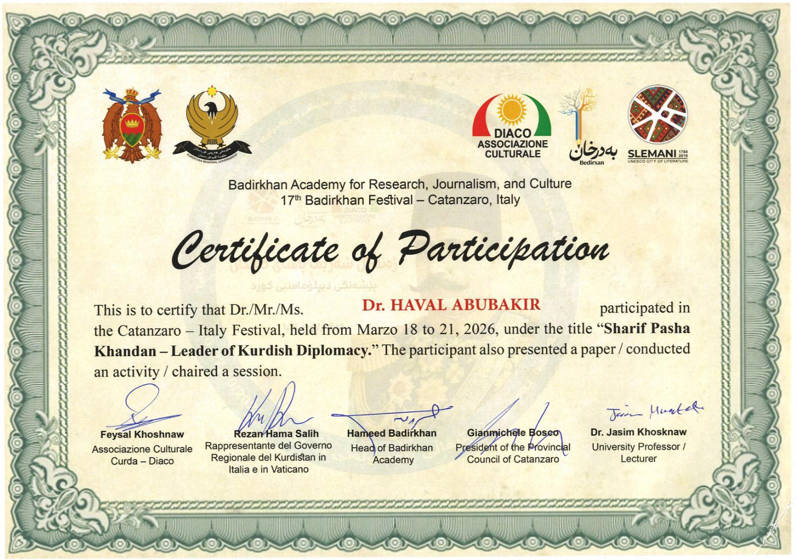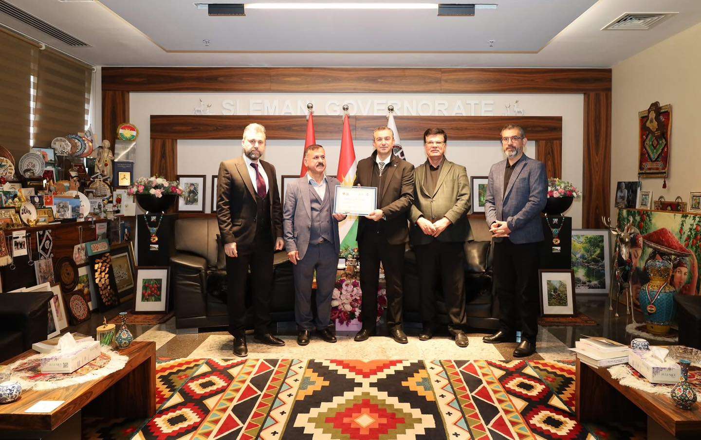 د.هەڤاڵ ئەبوبەکر پارێزگاری سلێمانی، لە دیوانی پارێزگادا، پێشوازیکرد لە بەڕێزان وەفدی پارێزگای سلێمانی و کوردستان بۆ حەڤدەیەمین فێستیڤاڵی نێودەوڵەتیی بەدرخان لە شاری کەتەنزارۆی ئیتاڵیا تایبەت بە ڕەوانشاد ژەنەراڵ شەریف پاشای خەندان پێشەنگی دیبلۆماسیی کورد، بەڕێزان (مامۆستا حەسەن یاسین، پ.د.هێرش ڕەسوڵ موراد، پ.د.ئیبراهیم سەعید زمناکۆ و هونەرمەند زاهیر سدیق)، کە بەمەبەستی پێشکەشکردنی سوپاسنامە و بڕوانامەی فێستیڤاڵەکە بە پارێزگاری سلێمانی وەک پشتیوانێکی سەرەکیی فێستیڤاڵەکە، سەردانی پارێزگاری سلێمانییان کردبوو.