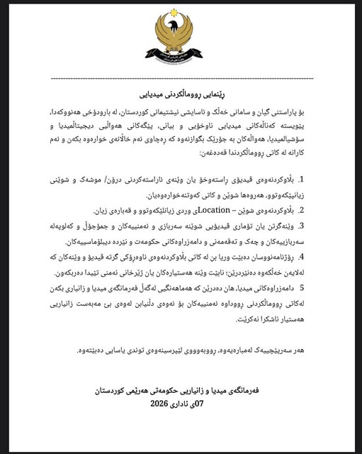 بۆ پاراستنی گیان و سامانی خهڵك و ئاسیشی نیشتمانی كوردستان ،له بارودۆخی ههنووكهدا.پێویسته كهناڵهكانی میدیایی ناوخۆی و بیانی ، پێگهكانی ههواڵی دیجیتاڵ میدیا و سۆشیل میدیا . ههواڵهكان به جۆرێك بگوازنهوه كه ڕهچاوی ئهم خاڵانهی خوارهوه بكهن و ئهم كارانه له كاتی ڕووماڵكردندا قهدهغهن.